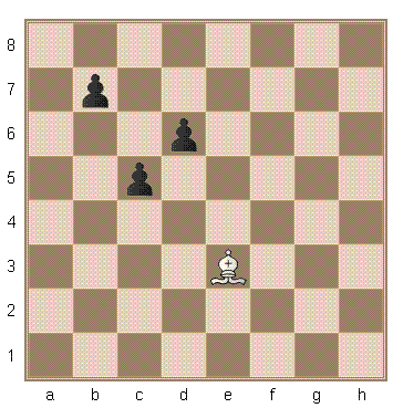 Пусть в представленном на рисунке примере слону требуется попасть на поле c5. Тогда одна из возможных оптимальных стратегий поведения пешек: b7->b6, c5->c4, c4->c3, c3->c2. Тогда белому слону понадобится пять ходов: e3->f4, f4->d6, d6->c7, c7->b6, b6->c5.