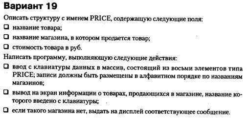 Вывод: отсортированный массив (сортировка по наименованию магазина, далее по наименованию товара), символьные переменные и число