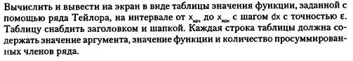 Вывод: таблица, каждая строка которой есть комбинация из четырех чисел – значение аргумента, значение функции, количество просуммированных членов ряда и расчет функции стандартными средствами с++