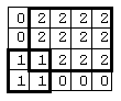 Получившуюся ситуацию записали в таблицу чисел (каждой клетке поля соответствует клетка таблицы). Если клетка поля не закрыта прямоугольником, то в соответствующую клетку таблицы записали число 0. Если же клетка закрыта одним или несколькими прямоугольниками, то в соответствующую клетку таблицы записали число, соответствующее номеру самого верхнего прямоугольника, закрывающего эту клетку.