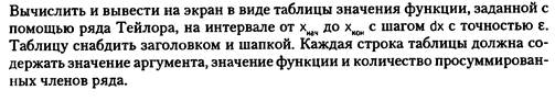 Вывод: таблица, каждая строка которой есть комбинация из четырех чисел – значение аргумента, значение функции, количество просуммированных членов ряда и расчет функции стандартными средствами с++