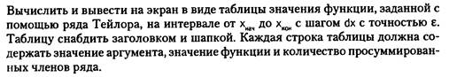Вывод: таблица, каждая строка которой есть комбинация из четырех чисел – значение аргумента, значение функции, количество просуммированных членов ряда и расчет функции стандартными средствами с++
