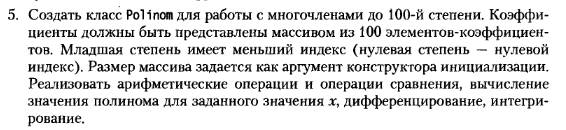 Вывод: результаты выполнения операций сложения, вычитания, умножения, деления, вычисления значения полиномов для заданного значения аргумента, результат дифференцирования полинома,   результат интегрирования полинома и результат операции сравнения при заданном значении аргумента(less, equal, greater).