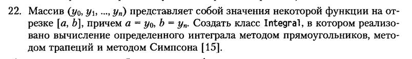Вывод: вывести исходные массивы, затем значения интеграла методом левых прямоугольников, методом средних прямоугольников, методом правых прямоугольников, методом трапеций, методом Симпсона и методом Ньютона (3/8).
