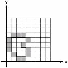 The path is closed and runs along the grid lines, i.e. between the squares of the grid. The path runs counter-clockwise, so if following the path is considered as going “forward”, the border pixels are always to the “right” of the path. The bitmap always covers 32 by 32 squares and has its lower left corner at (0,0). You can safely assume that the path never touches the bounding rectangle of the bitmap and never touches or crosses itself. Note that a bit gets set if it is on the outside of the area surrounded by the path and if at least one of its edges belongs to the path, but not if only one of its corners is in the path. (A look at the convex corners in the figure should clarify that statement).